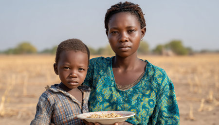 African mother holds her son and a plate of food, highlighting issues of poverty and food insecurity in developing countries