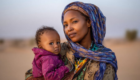 A mother with a sad child, searching for food in a drought-stricken African village.