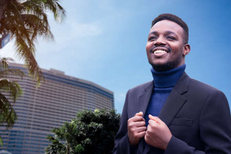 A happy smiling African businessman in a suit at a luxurious tropical beachfront hotel