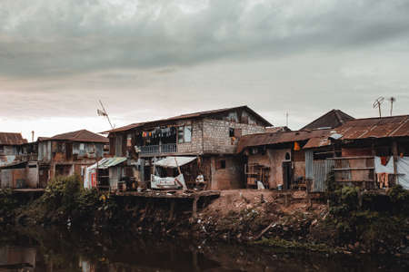 MANADO, NORTH SULAWESI, INDONESIA - AUGUST 3, 2015: View of a ghetto by a river with pollution, the poorest part of Manado city, on August 3, 2015 in Manado, North Sulawesi, Indonesia