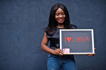I love Liberia. Fashionable african woman hold chalkboard with liberian flag.