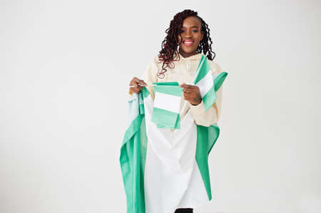 Nigerian woman hold Nigeria flag isolated on white wall.