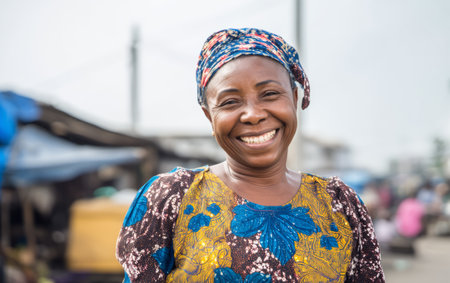 A woman smiles brightly while standing in a bustling market. She wears a colorful dress and scarf. People and stalls fill the background under a clear sky. It is daytime.