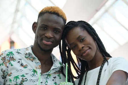 Stylish african couple taking a selfie and looking at camera. Summertime concept.