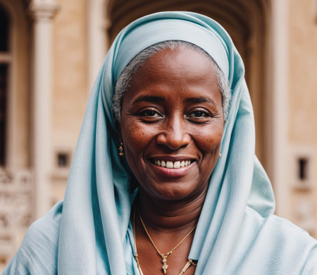A Djiboutian woman wearing a blue scarf and necklace is smiling