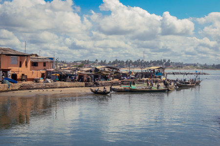 Atlantic Ocean View in the Elmina port with Boats and small Ships in Ghana, West Africa