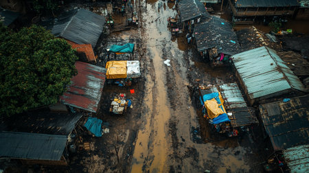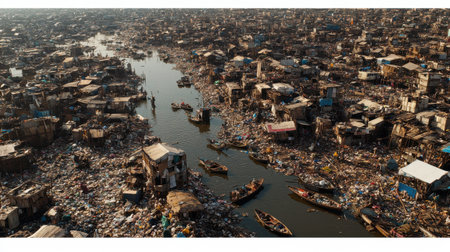 Boats navigating a polluted canal surrounded by precarious shacks in makoko slum, lagos, nigeria, highlighting the devastating impact of extreme poverty and environmental degradation. Generative ai
