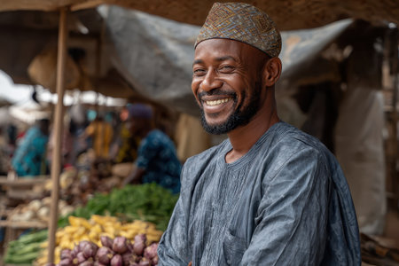 Happy Nigerian trader smiling while holding real produce at a bustling local market in the afternoon, reflecting vibrant community life and cultural richness
