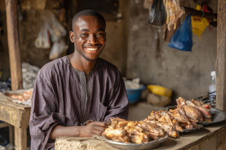 Happy Nigerian trader at local market showcasing a variety of fresh chicken dishes and smiling at customers in a vibrant trading atmosphere