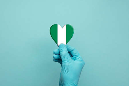 Hands wearing protective surgical gloves holding Nigeria flag heart