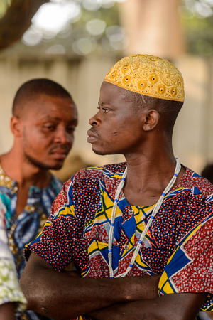 OUIDAH, BENIN - Jan 10, 2017: Unidentified Beninese man in national suit crosses his arms at the voodoo festival, which is anually celebrated on January, 10th.