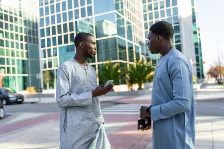 Two Senegalese businessmen wearing traditional dashiki attire are discussing business outdoors, with one holding a smartphone