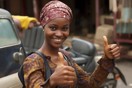Generative AI depicts a Jamaican woman commuting by transport while smiling and having pleasure in the sun.