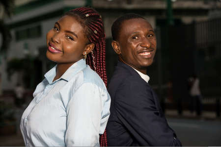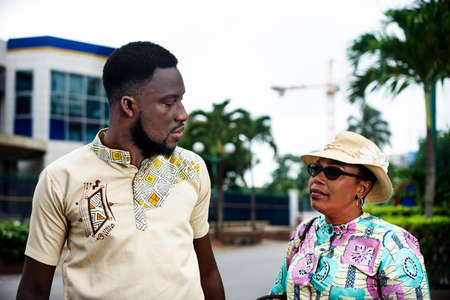 Couple of African tourists stroll on the sidewalk of a sunny street while talking well dressed in a loincloth portrait of happy couple of healthy people; looking at the camera. Elderly and happy wife and husband enjoying life after retirement