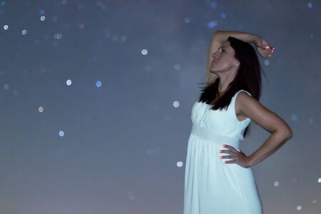 Woman in white long dress under starry night. Woman looking to starry night. Woman under night sky, Defocused night sky.