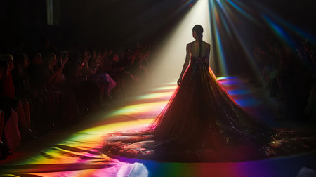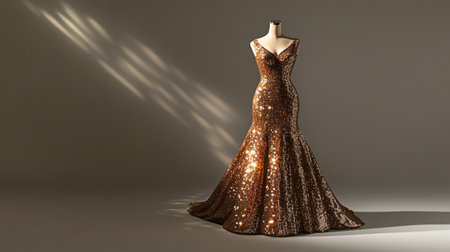 A stunning gown radiates light with shimmering details, creating a magical atmosphere in a dim room.