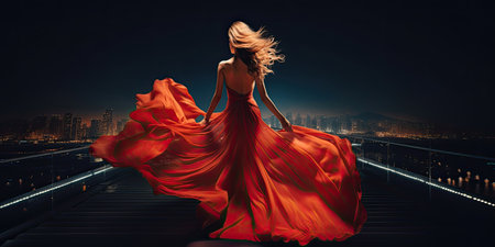 Young ellegant woman standing on the ligths of the night city background on bridge. Sexy romantic beautiful young mixed race Caucasian Asian girl with perfect makeup in long red evening dress standing over view on night river and moon in bokeh. Freedom, in love, dating concept