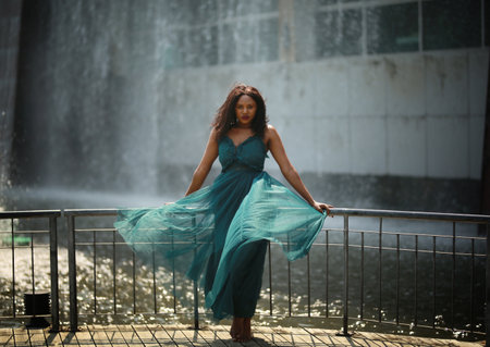Close up studio portrait of young attractive african woman wearing party dress against dark background. Sexy girl playing with braids.