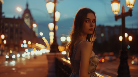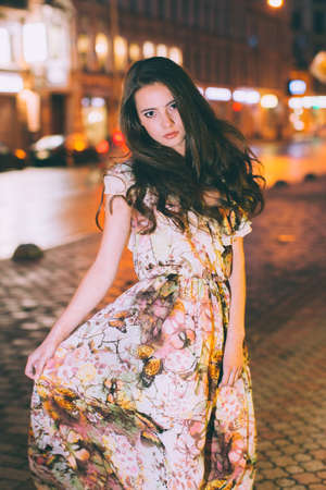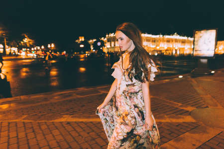 Beautiful woman in gorgeous dress against the backdrop of the city at night. Motion effect.
