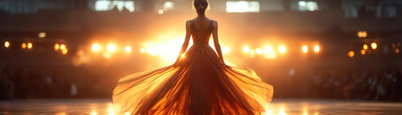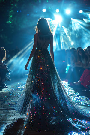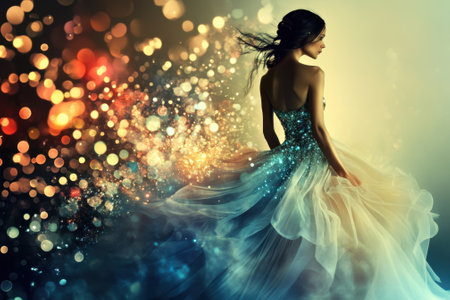 A graceful woman in a shimmering dress swirls amidst a mesmerizing backdrop of colored lights and sparkles.