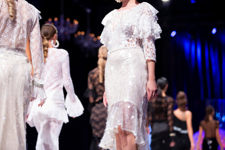 Female models walk the runway in different white dresses during a Fashion Show. Fashion catwalk event showing new collection of clothes.