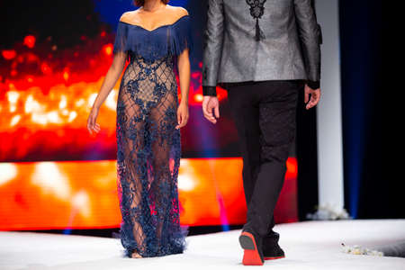 Female and male models walk the runway in beautiful designer clothes during a Fashion Show. Fashion catwalk event showing new collection of clothes. Unrecognizable people.