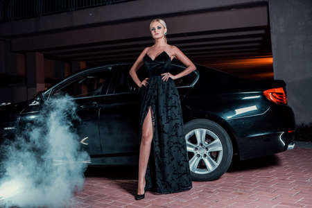 fashion portrait of beautiful sexy woman model girl posing standing near black car with bright makeup at night