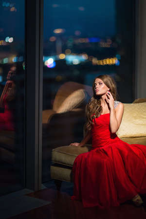 Charming young woman in red sexy dress posing. Sensual gorgeous young woman on high heels in red outfit. Photo of attractive long legs. obsession with red. Selective focus, filmgrain