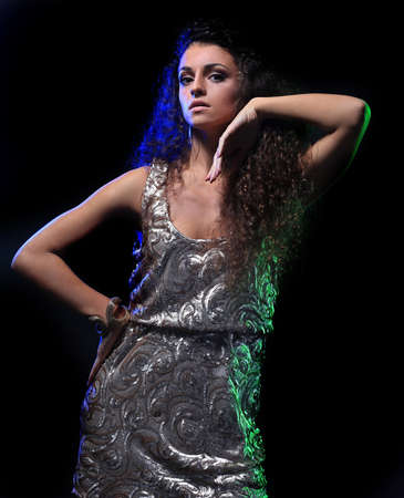Young beautiful curly women in glitter dress on dark background. Copyspace. Concept celebration. Dark background