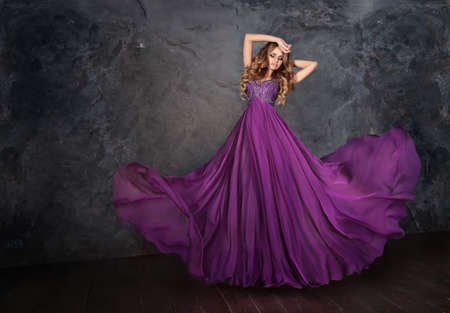 oung beauty woman in fluttering dress. Dance, movement. Long skirt flutters.