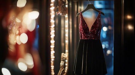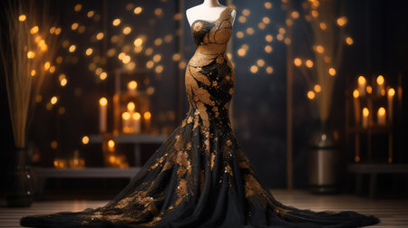 A stunning black dress featuring sparkling constellations is showcased in a contemporary clothing boutique.