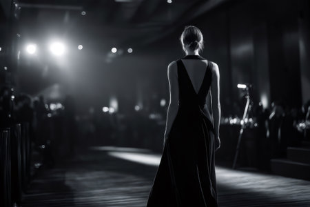 Female models walk the runway in different black dresses during a Fashion Show. Fashion catwalk event showing new collection of clothes.