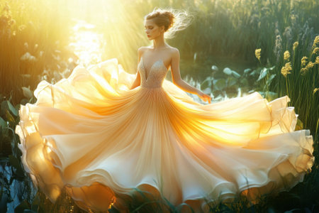 A woman twirls gracefully in a luminous golden dress amidst tall grass and flowers at sunset.