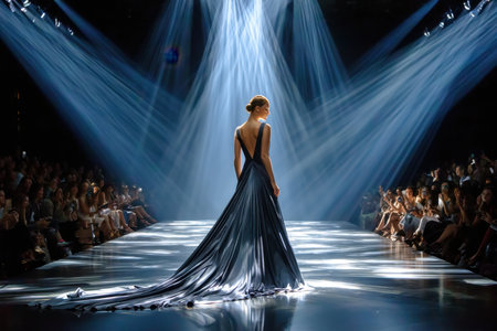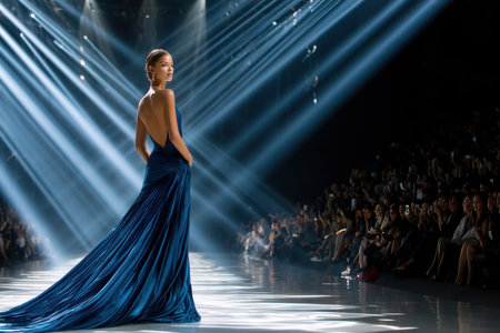 Female model walks the runway in blue dress isolated on a black background during a Fashion Show. Fashion catwalk event showing new collection of clothes. Single female model in beautiful dress.