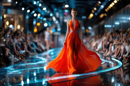 A woman in a stunning floral dress walks the runway, showcasing elegant fashion.