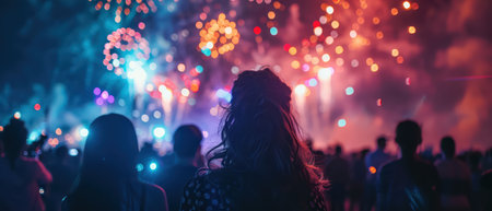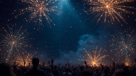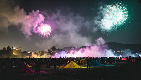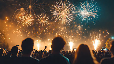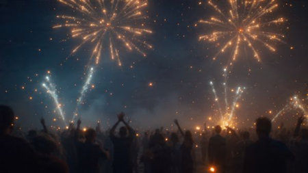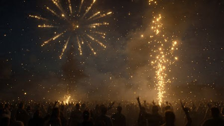 A captivating firework display illuminating the night sky during a cultural celebration, with spectators gathered to witness the spectacle, symbolizing joy and communal spirit.
