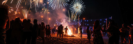 People gather on the beach, dancing joyfully around a bonfire while colorful fireworks explode overhead, creating a festive atmosphere.