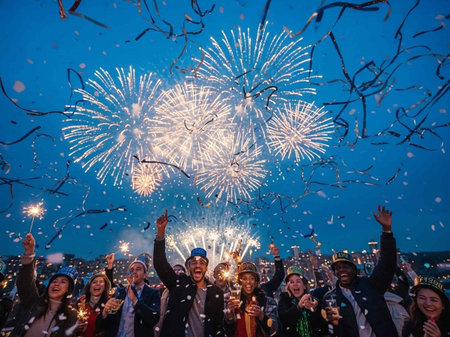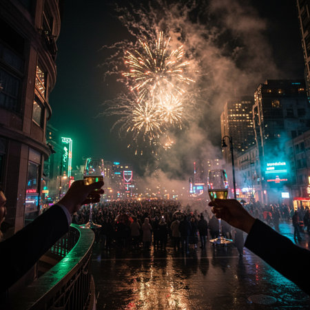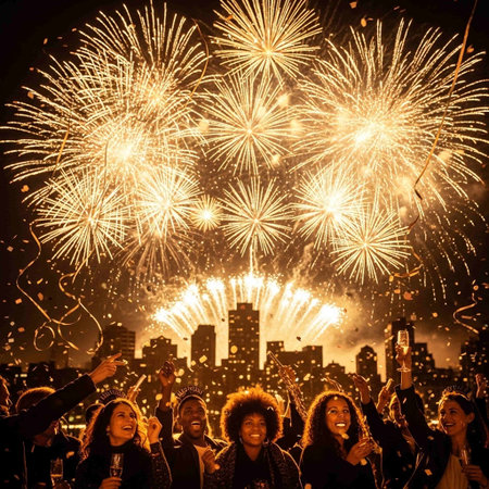 People gather joyfully to celebrate New Years Eve with fireworks illuminating the night sky and a vibrant countdown to the new year.