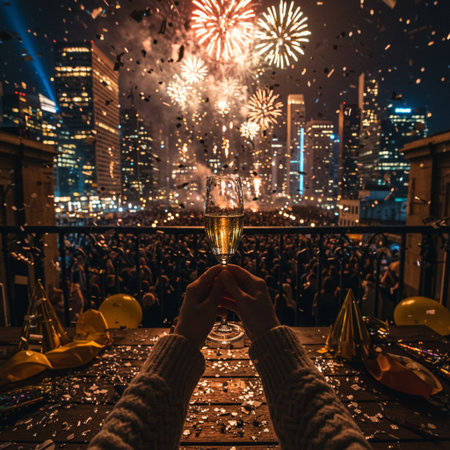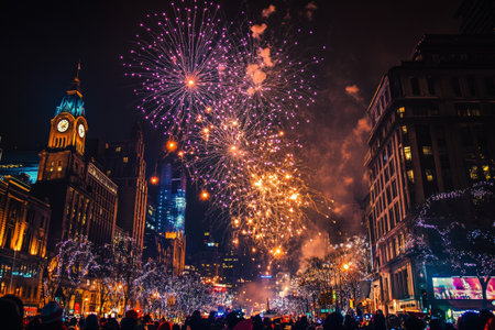 Capture the celebratory spirit of the New Year with this spectacular bursting with vibrant and colorful fireworks in the night sky Enjoy the joyous atmosphere of people in celebratory attire holding sparklers and glasses of champagne against an urban landscape of iconic buildings magnificently lit up in the night sky reflections of the fireworks shimmering in nearby body of water Great for conveying a sense of grandeur celebration and the start of a hopeful new year