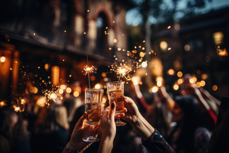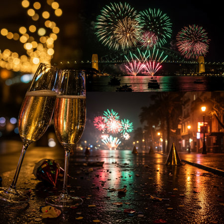champagne, glasses, toast, celebration, lights, confetti, streamers, fireworks, festive, joyful, holiday, occasion, bubbly, decor, background, sparkling