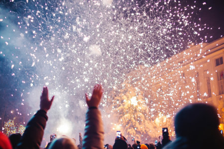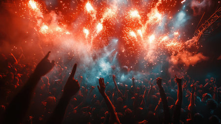 Unfocused image of a joyful crowd with raised hands enjoying a night celebration with colorful fireworks and confetti.