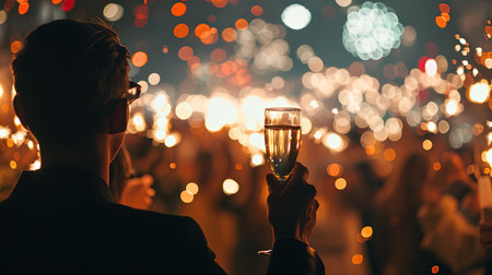 Aerial view of fireworks and people celebrating new year with champagne glasses