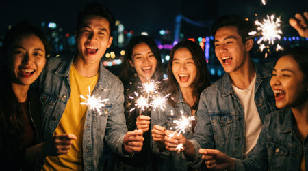 A cheerful group of diverse young Asian men and women laugh and hold burning sparklers during a nighttime celebration outdoors, creating a festive and joyful atmosphere.