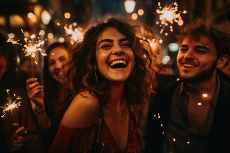 Group of people are celebrating with fireworks and one woman is holding a bottle. Scene is joyful and festive