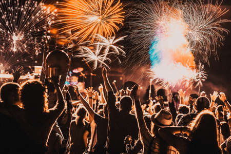 cheering crowd and fireworks - New Year celebration concept