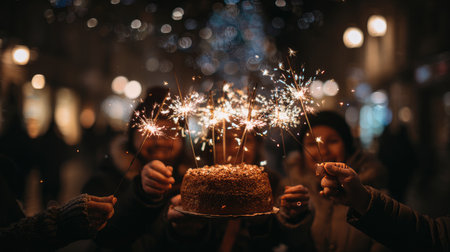 A vibrant and warm celebration scene featuring a beautifully decorated cake with sparklers surrounded by joyful people enjoying the festive atmosphere.