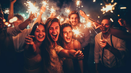 Friends happy celebration with sparklers outdoors. Young people christmas party. New Year concept