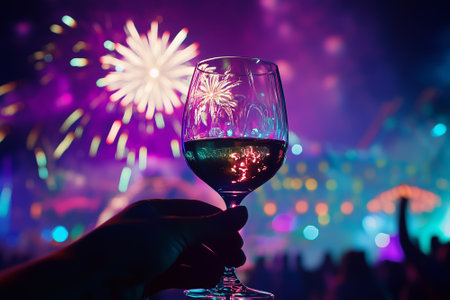 Hand of people show wine glass with multicolor fireworks in the background. Festive party celebration concept. By generative Ai