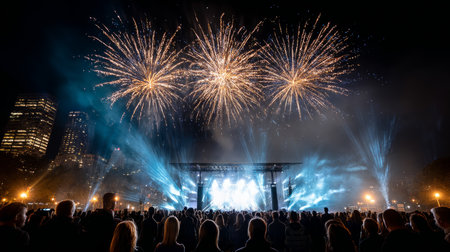 Vibrant colors ignite the night sky in a celebration event generated by artificial intelligence