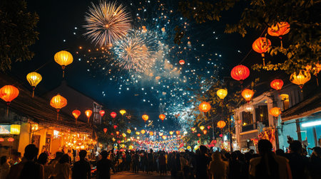 Colorful fireworks light up the night sky over a lively city street filled with spectators celebrating the New Year. The atmosphere is vibrant with decorations.
